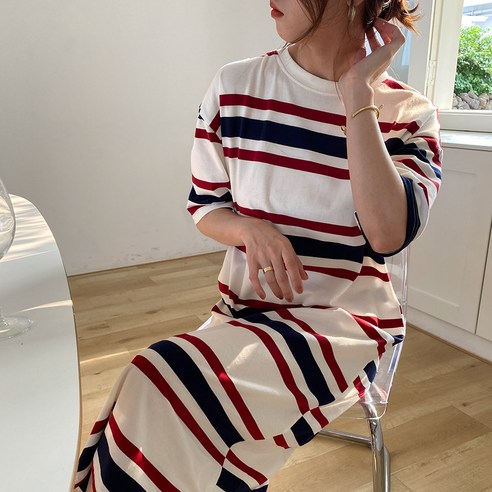 100144C 부드러운 순면 스트라이프 줄무늬 여성 롱원피스